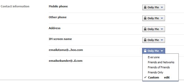Customize Settings Contact Information Facebook Published January 18, 2011 at 600 × 267 in Cara Hidden Email Facebook Terbaru Pada bagian Contact information, kustomisasi email dengan mengklik tab di bagian kanan email kamu dengan memilih Custom.